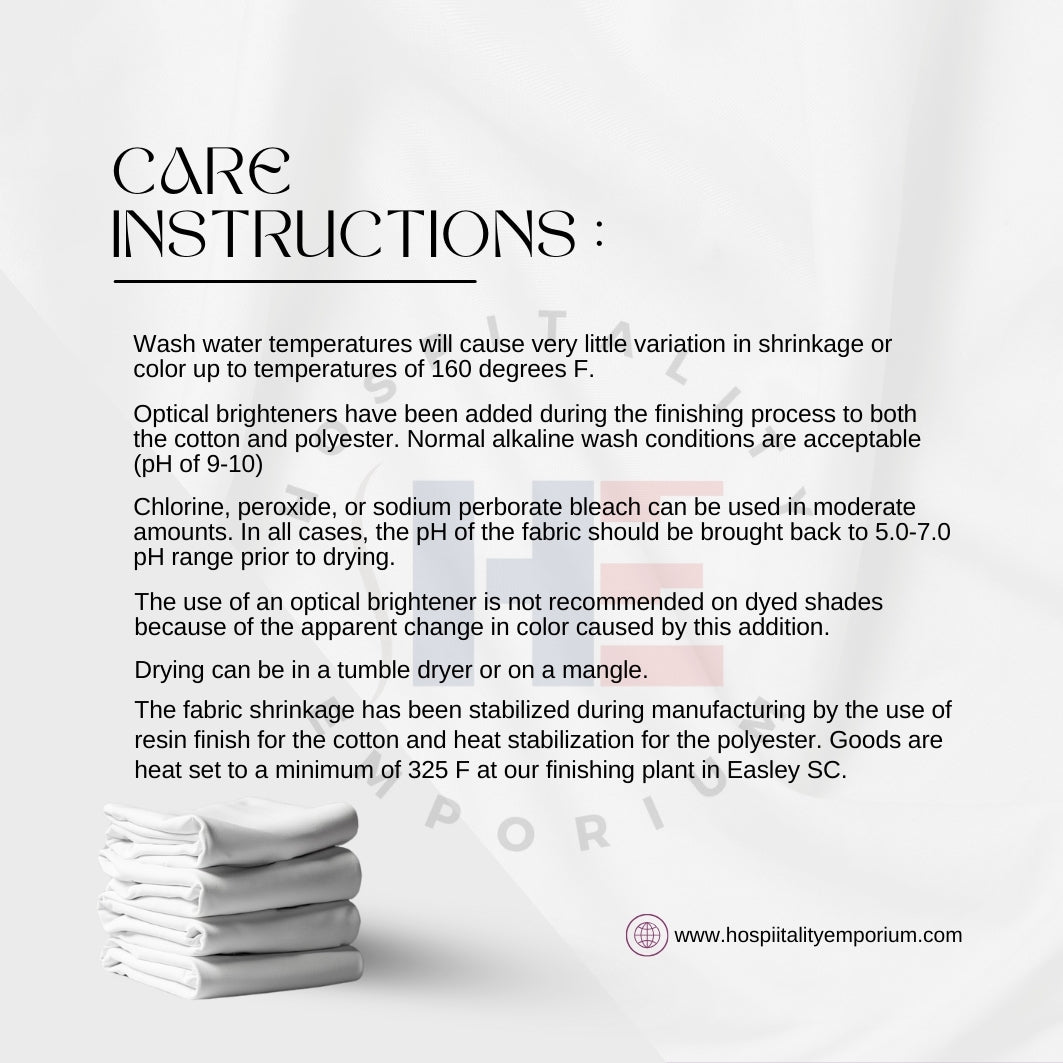 Sheets manufactured by Thomaston Mills contain polyester and cotton fibers. The laundry care instructions can vary depending on the equipment used by various laundries but should follow the below listed guidelines.