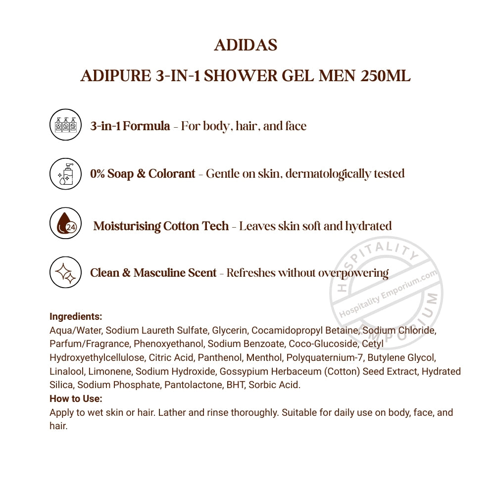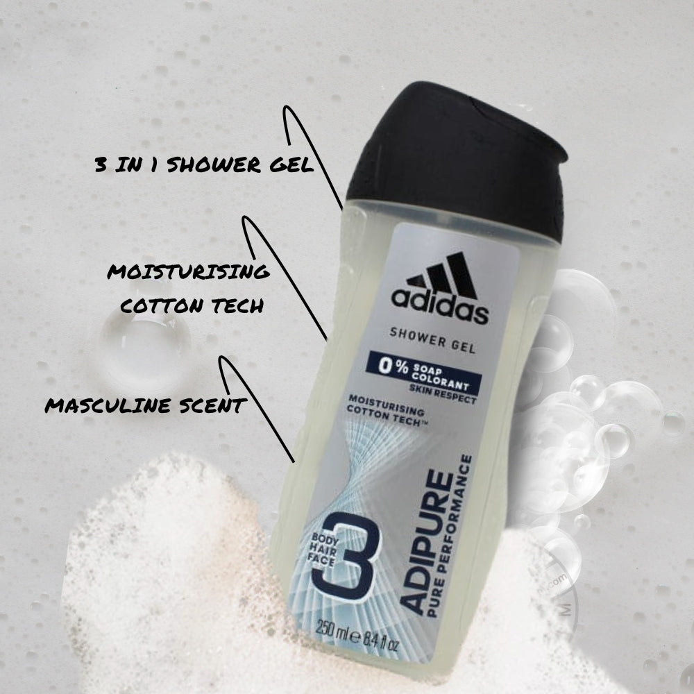 Designed for the face, hair, and body, Adidas Adipure 3-in-1 Shower Gel offers all-in-one grooming. Its recipe, enhanced by moisturizing Cotton TechTM, thoroughly cleanses while preserving the natural equilibrium of your skin. With zero soap and colorants, this dermatologist-tested gel is gentle enough for everyday use without sacrificing performance or freshness. Ideal for busy guys and sportsmen seeking a quick and efficient shower solution.