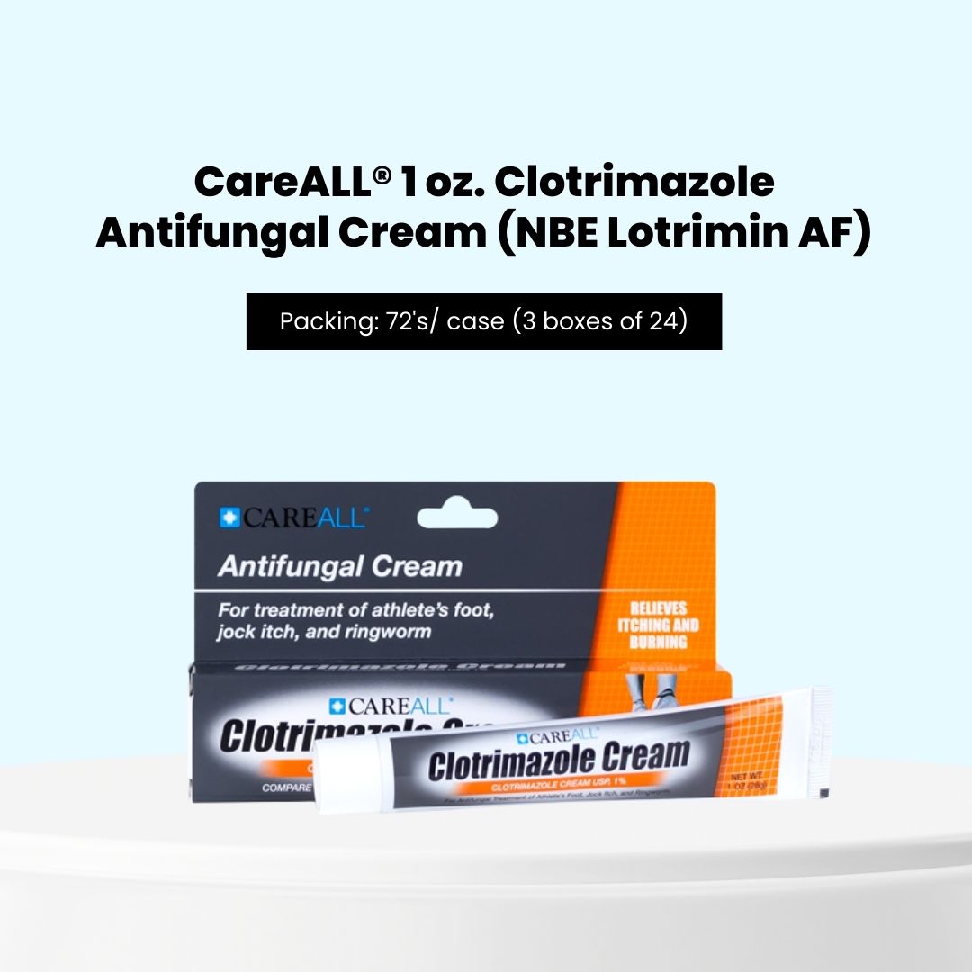 CareALL® 1 oz. Clotrimazole Antifungal Cream (NBE Lotrimin AF) is a powerful solution for treating fungal infections, including athlete's foot, jock itch, and ringworm. Formulated with clotrimazole, this cream effectively eliminates fungus while soothing itching, burning, and irritation. The convenient 1 oz. tube allows for easy application, making it perfect for home or travel use.