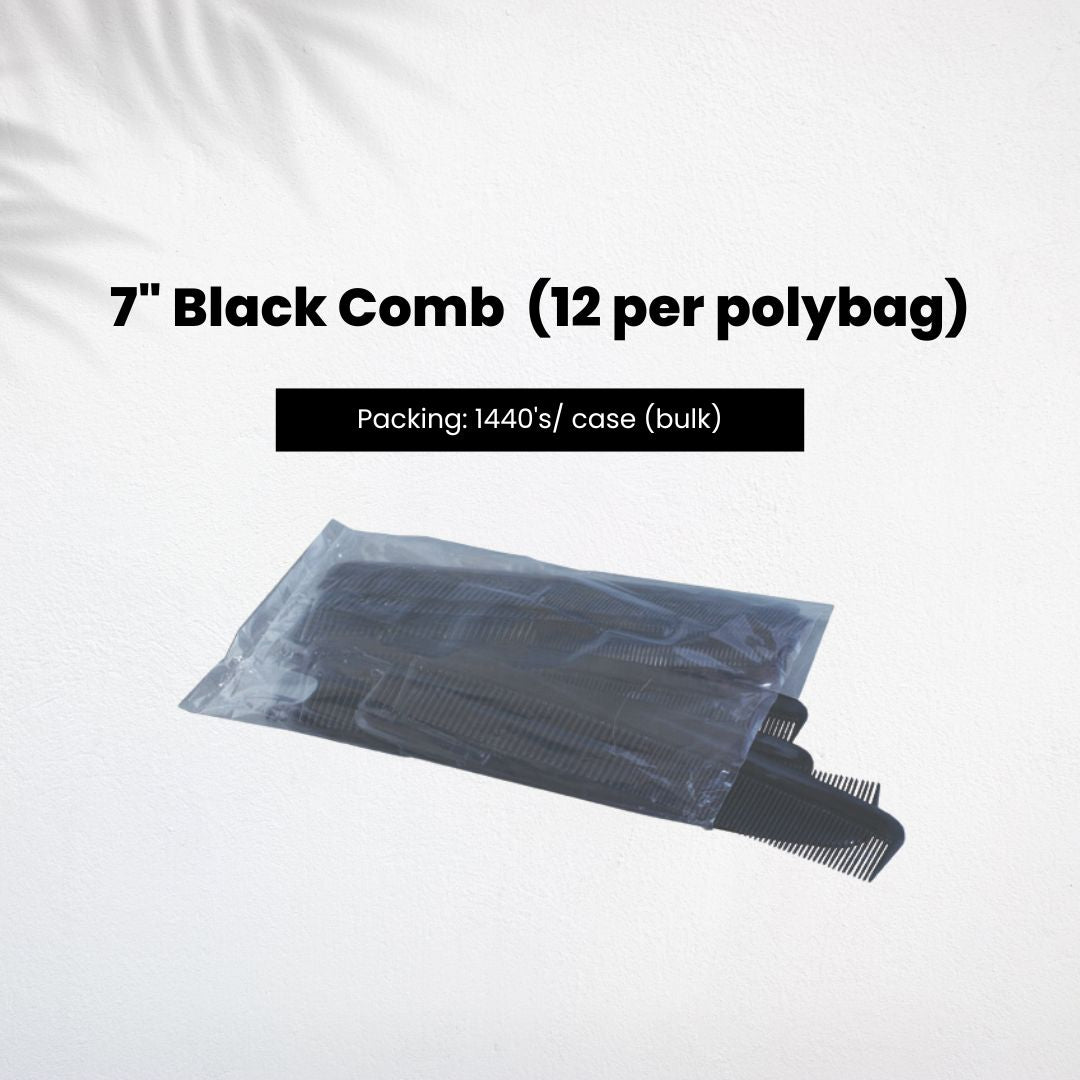 The 7" Black Comb (12 per polybag) is a convenient and durable grooming tool, designed for styling and detangling. Each polybag contains 12 black combs, making it a perfect choice for bulk purchases, salons, or promotional giveaways. Crafted from high-quality plastic, these combs feature evenly spaced teeth that provide smooth detangling without causing damage to the hair.
