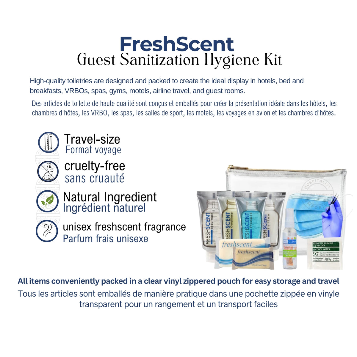 Experience ultimate freshness and cleanliness with our FreshScent Guest Sanitization Hygiene Kit. Each pack contains essential items designed to keep you feeling rejuvenated and protected during your travels.