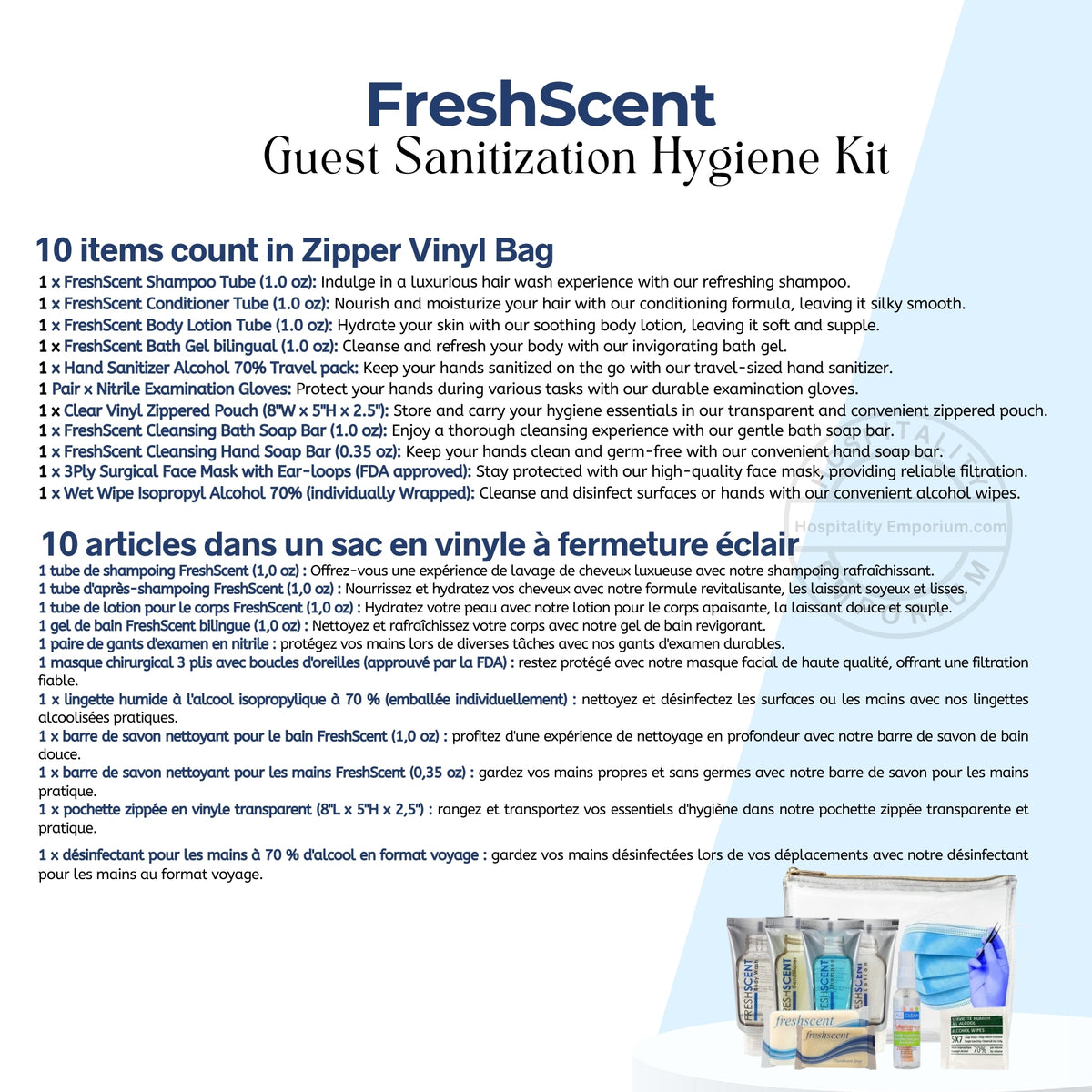 Guest Sanitization Hygiene Kit FreshScent 10 items count in Zipper Vinyl Bag (Count 24's/Pack)