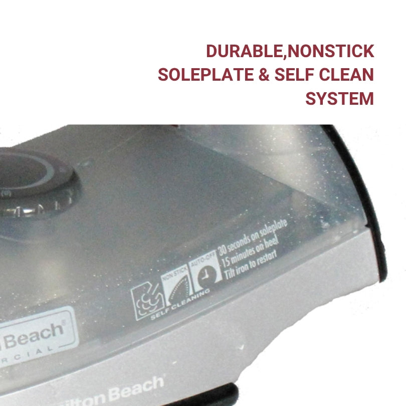 Elevate your ironing experience with the Hamilton Beach Black Lightweight Steam/Spray Iron. Designed to meet the demanding needs of hospitality settings, this iron ensures guests always look their best with its excellent steam performance. The adjustable steam feature provides versatility, allowing users to tailor their ironing experience to suit different fabric types and garment needs. Stubborn creases are effortlessly smoothed out, leaving shirts crisp and dresses, pants, and skirts perfectly pressed. Featuring a durable nonstick soleplate that glides effortlessly across any fabric, this iron offers convenience and efficiency. Guests can choose between two steam options: a powerful blast for natural fabrics like cotton or linen, and vertical steam for hanging clothes without the need for an ironing board. Additionally, the iron boasts a 3-way position sensing automatic shutoff for added safety and peace of mind. Backed by a 1-year warranty, the Hamilton Beach Lightweight Steam/Spray Iron is a reliable choice for any hospitality establishment.