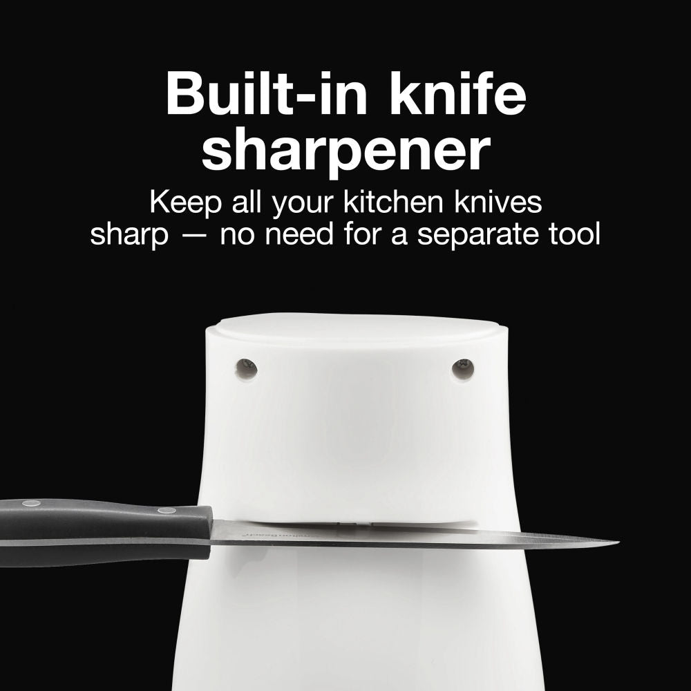The can opener is packed with convenient features that make your life easier. It includes a built-in knife sharpener, located in the back of the opener, to help keep your kitchen knives their sharpest without the need for a separate sharpening tool. And the cord neatly pushes into a storage area at the base of the opener to reduce countertop clutter.