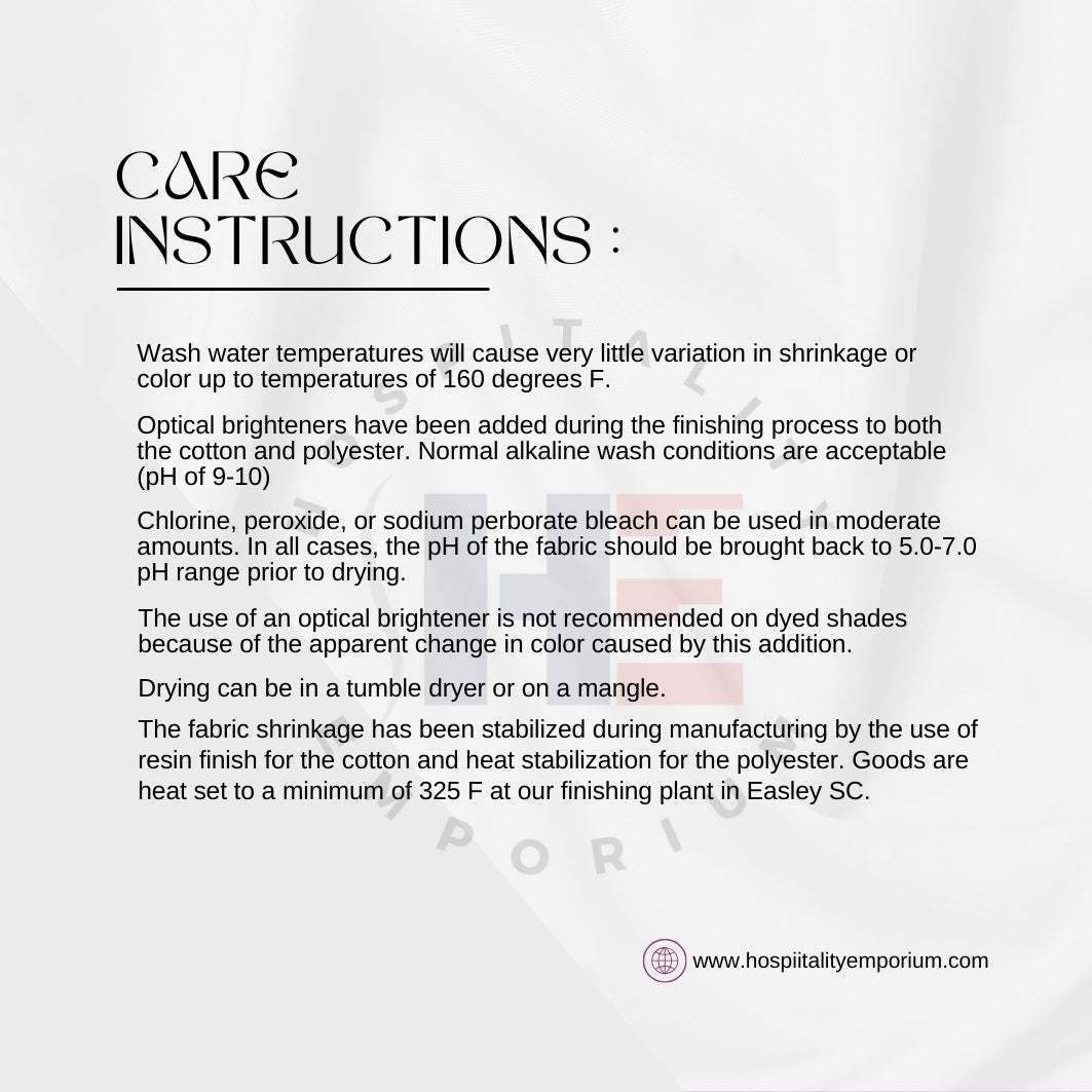 Sheets manufactured by Thomaston Mills contain polyester and cotton fibers. The laundry care instructions can vary depending on the equipment used by various laundries but should follow the below listed guidelines.