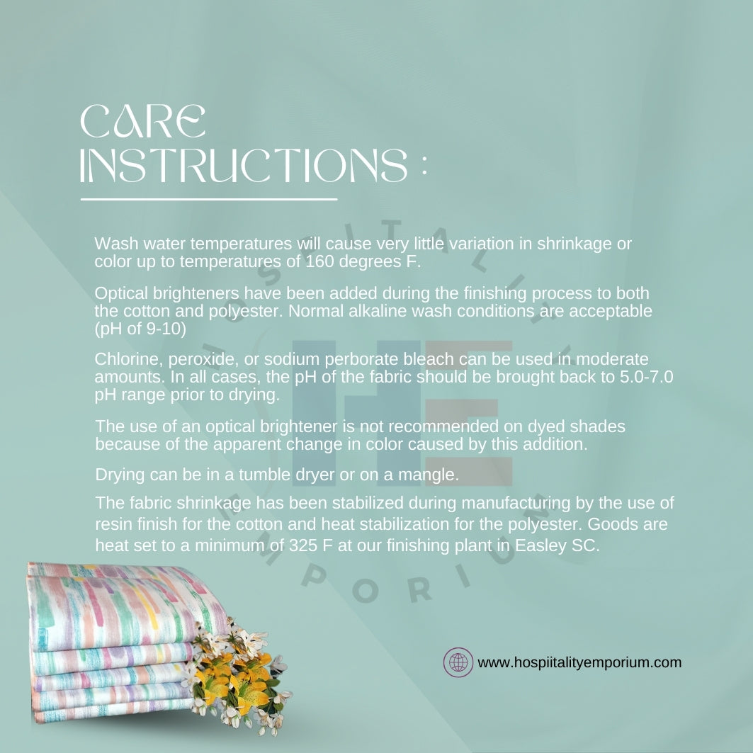 • Drying can be in a tumble dryer or on a mangle. The fabric shrinkage has been stabilized during manufacturing by the use of resin finish for the cotton and heat stabilization for the polyester. Goods are heat set to a minimum of 325 F at our finishing plant in Easley SC.